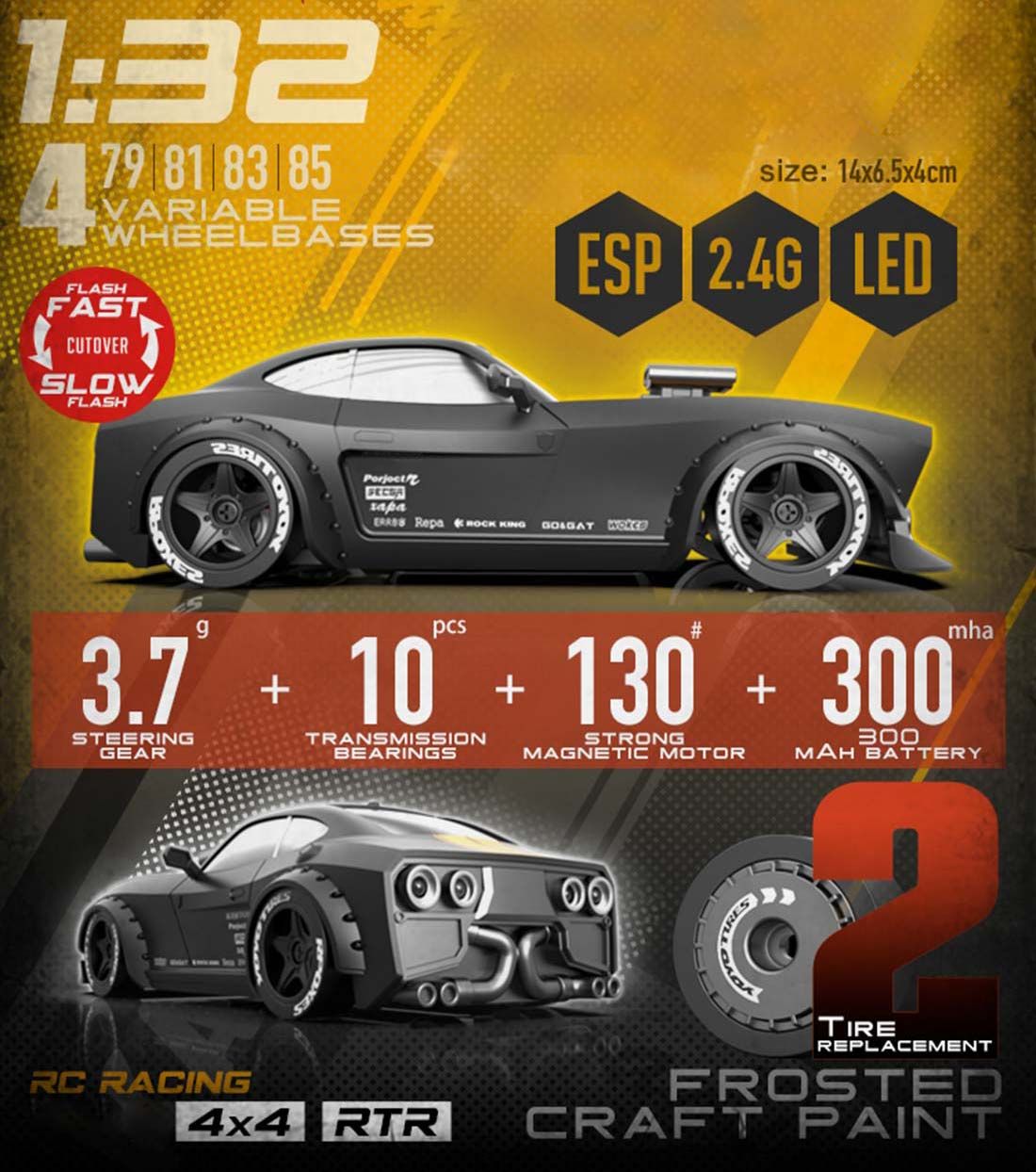 four adjustable wheelbase options (79mm-85mm), allowing you to fit different body shells or tune the handling.