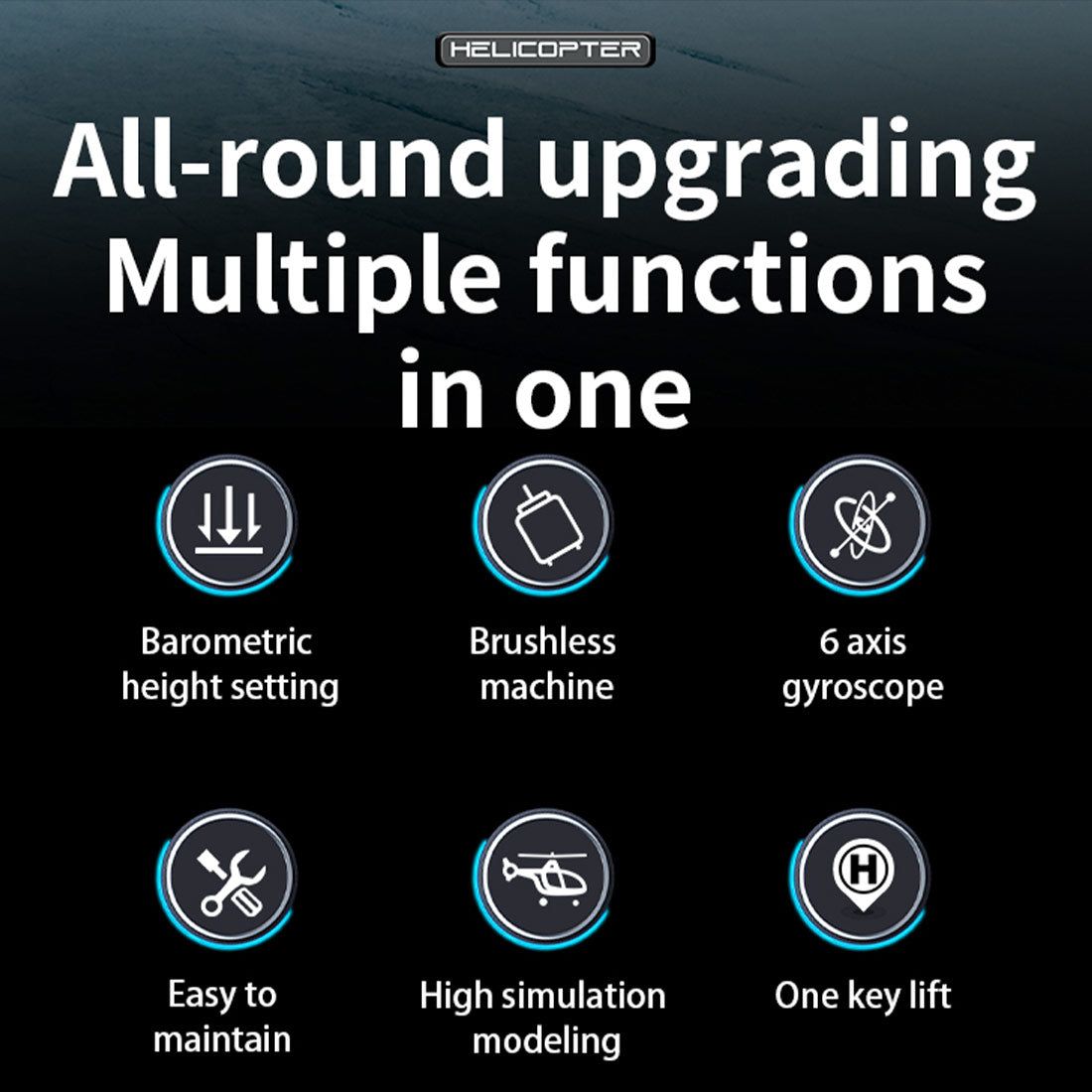 Flying made easy. The advanced flight control system integrates a 6-Axis Gyroscope, Barometric Altitude Hold, and Optical Flow Positioning. This trio of technologies ensures the helicopter hovers steadily and locks its position automatically, making it perfect for novice pilots learning the ropes.