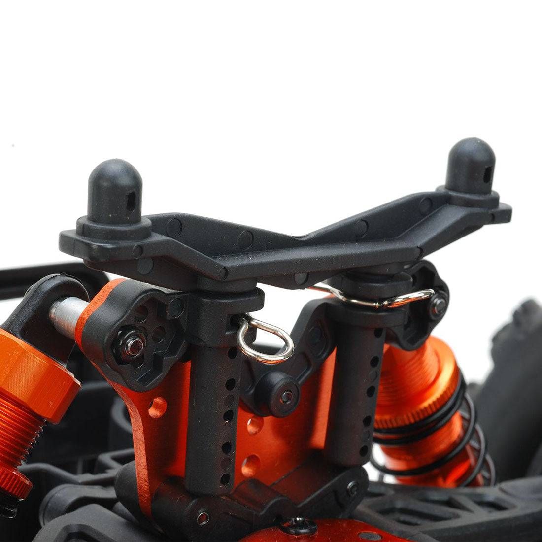 Durability is key. The Zombie features an anodized T6 3mm aluminum chassis with recessed screws to prevent damage. A matching aluminum top spine creates a rigid structure that resists bending during massive jumps. The side protection plates are molded from tough plastic to shrug off impacts, ensuring your truck survives the roughest bash sessions.