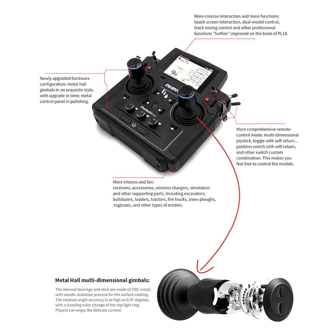 - Joysticks: 5D Hall Sensor Gimbals with dual metal levers