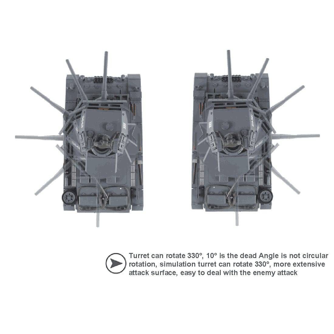 You are in complete control. The 2.4G remote system allows for interference-free operation up to 100 meters. Execute 360° pivot turns, rotate the turret 320° to track targets, and raise or lower the barrel for the perfect shot. The independent suspension system allows each road wheel to move individually, letting the tank glide over rocks and rough terrain with the grace of the real machine.